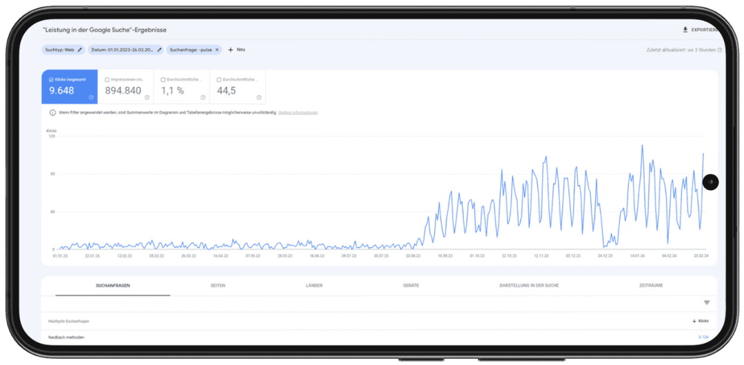 Pulse Feedback hat seit Beginn des Content-Projekts seine Klicks verfünffacht und hat mit 131 Top3 Rankings eine deutlich höhere Sichtbarkeit für das eigene Thema, also noch vor einem Jahr. Dort hin brachte sie hilfreicher Content angepasst auf die Bedürfnisse der Zielgruppe und ein langer Atem.