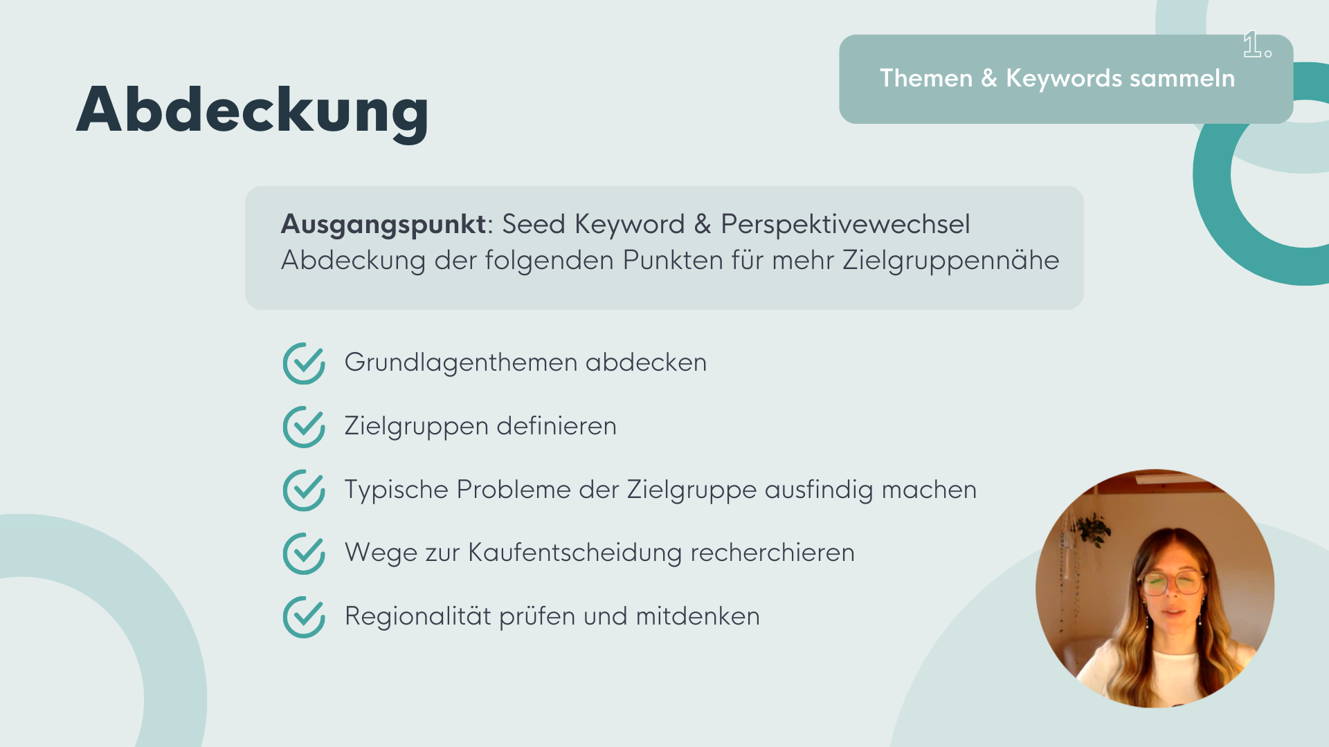 In dritten Modul entwickelst du eine umfassende Keyword-Liste, identifizierst relevante Suchbegriffe und nutzt verschiedene Methoden zur Themenfindung.