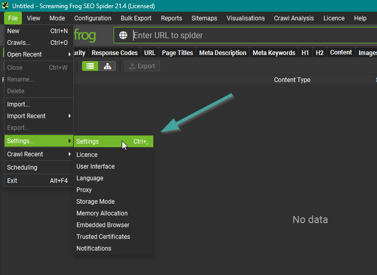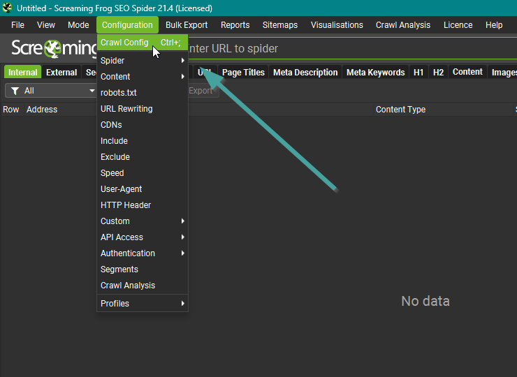 Wichtig: Die Konfiguration ist nicht permanent, das heißt, dass sie sich beim Schließen des Screaming Frogs zurücksetzt.