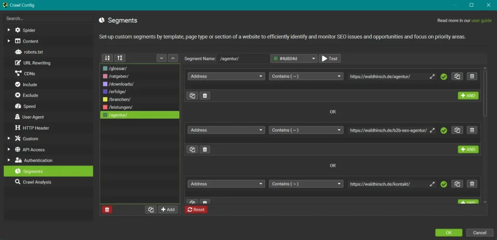 Für den Anfang kannst du Segmente über wichtige URL-Verzeichnisse aufbauen. Wenn du später weitere Ideen hast, wie du deine Crawls einfärben willst, stehen dir beinahe grenzenlose Optionen zur Verfügung.